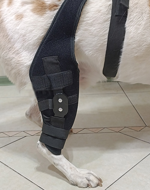 Фиксатор для колена для собак с шарнирами препятствует переразгибанию коленного сустава и тем самым предупреждает повреждение передней крестовидной связки (ПКС), обеспечивает стабилизацию и снижает динамические нагрузки на связочный аппарат задней конечности животного. Бицентричные шарниры предотвращают латеральные и медиальные смещения колена, обеспечивает поддержку суставов, уменьшают боль, снимают напряжение и облегчают движение питомца при травмах и системных заболеваниях коленного сустава.